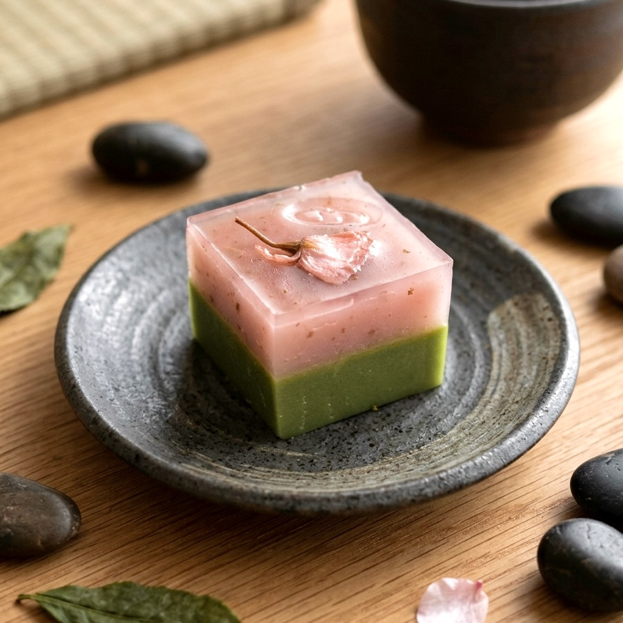 A layered yokan that brings together the earthy depth of ceremonial-grade matcha and the delicate floral notes of sakura. The base is crafted from smooth white bean paste blended with vibrant matcha, topped with a soft sakura bean layer and finished with a pickled cherry blossom. Balanced, refined, and lightly sweet, this confection captures the essence of spring in every bite.