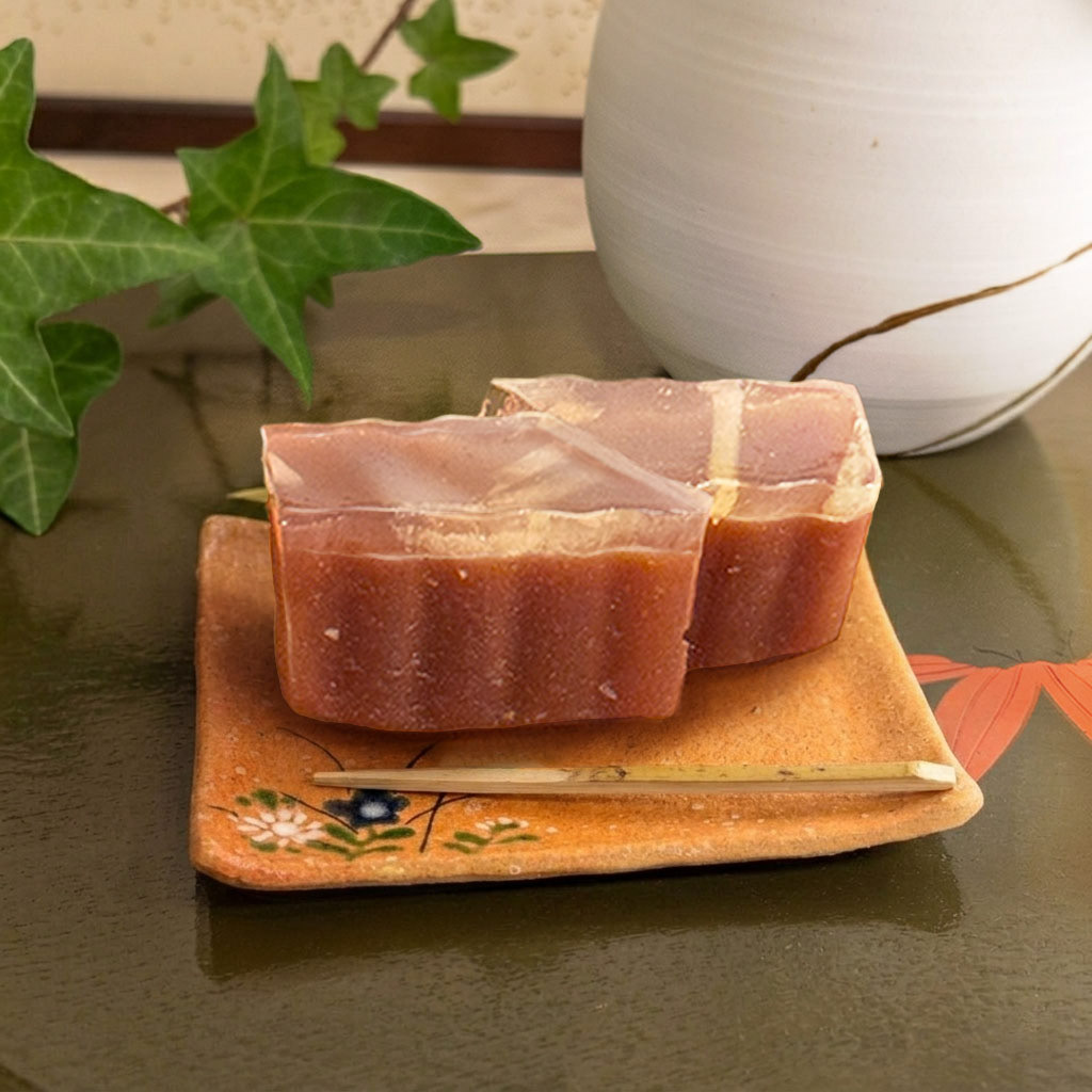 A summer-inspired yokan that blends the brightness of seasonal sangria with traditional Japanese confectionery. The base is a smooth red bean yokan, layered with a delicate orange blossom jelly infused with house-made sangria crafted from Asian pears, peaches, apples, oranges, lychee and more. Light, fragrant, and gently sweet, this piece captures the essence of warm summer evenings in a refined bite.